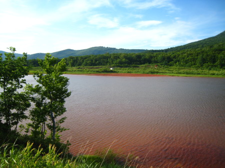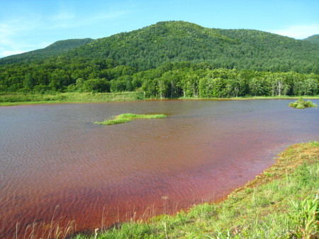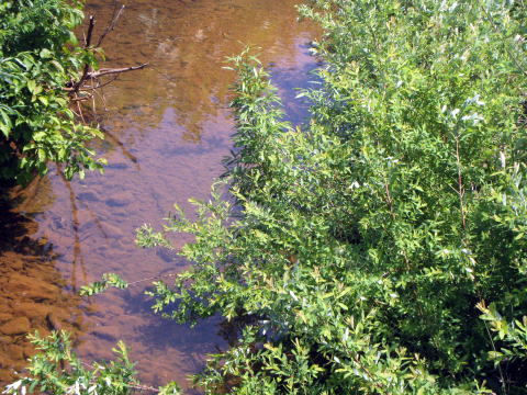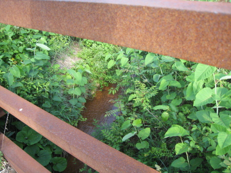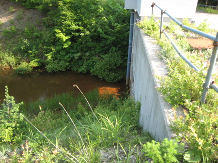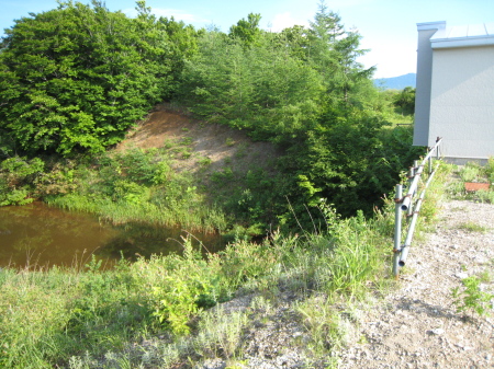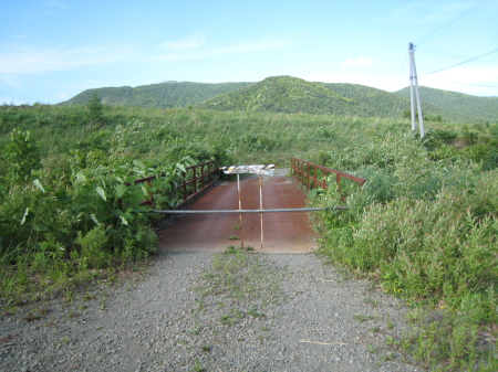 立ち入りゲートから少し進むと 田代ダムからの、上澄みの流れる、小川にかかる小さな橋が見えてきます 橋の上から、流れを確認すると、やはり 底石が褐色に汚れていました |