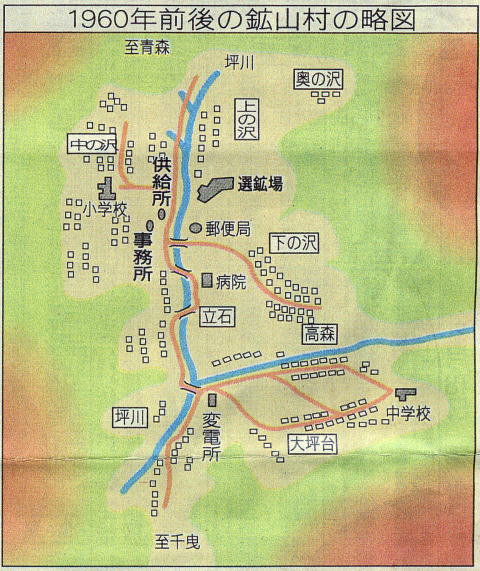 天間林村と青森市との境にある山中古くから鉱石が眠っているとささやかれ、大正時代から二、三の業者が調査を始めた。1940(昭和15)年には日本鉱業株式会社が鉱山の権利を得て、硫化鉱山として本格創業に入る、窒素肥料の原料になる硫化鉄鉱。食料の増産が至上命題だったこの時代、掘っても掘っても需要に追いつかない、翌41年のは高品位銅鉱も発見され、武器製造に使われる重要な金属としてもてはやされた。